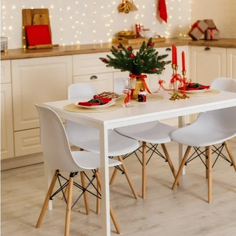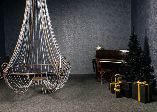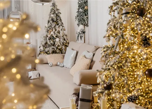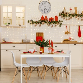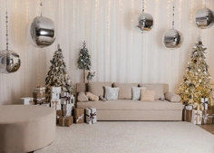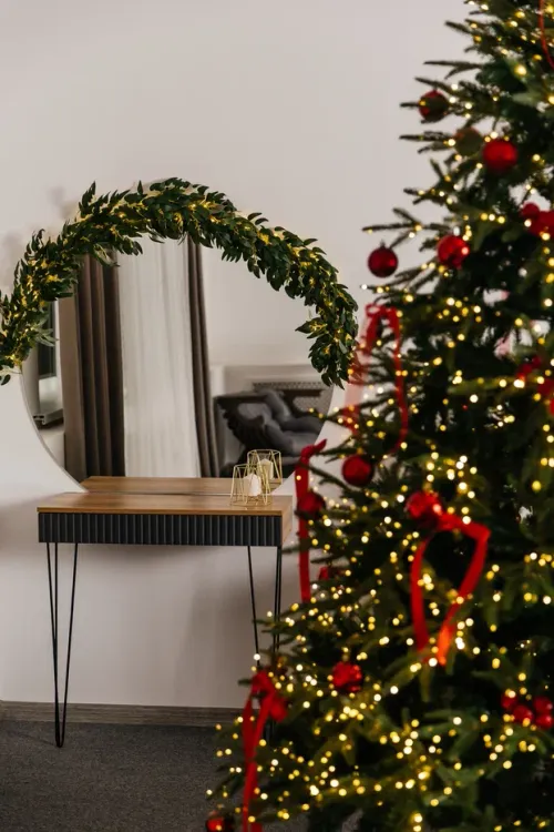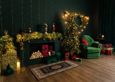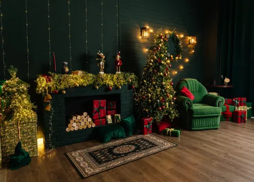 Вся композиция выполнена в классической новогодней палитре — сочетание красного и зелёного цветов создаёт тёплую, праздничную атмосферу. Мягкий свет гирлянд и продуманные детали делают эту комнату идеальным местом для встречи Нового года, где каждый элемент наполнен духом праздника и домашнего уюта.