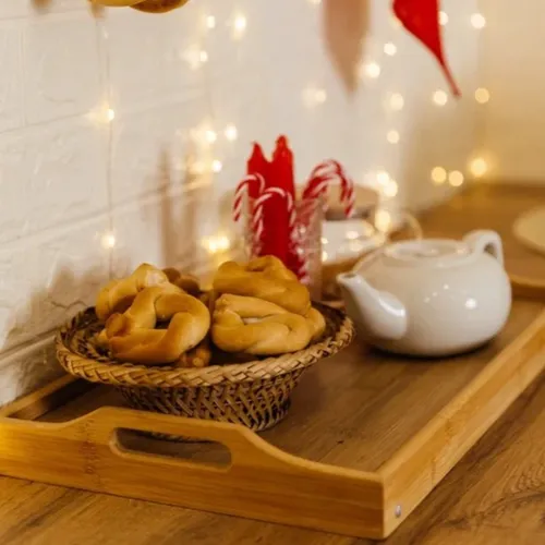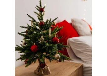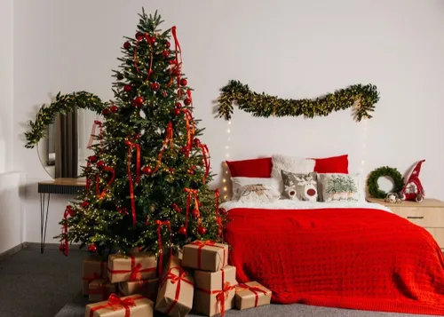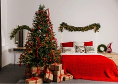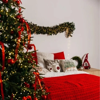 Эта уютная спальня словно перенесла нас в атмосферу волшебного Нового года! Центральное место занимает кровать с ярким красным покрывалом, которое гармонично сочетается с праздничным декором. На кровати расположились мягкие подушки с новогодними рисунками: милые олени и ёлочки создают ощущение тепла и уюта.